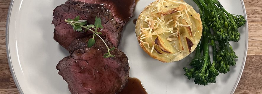 5. Seal the Chateaubriand in a hot pan then baste with butter, thyme, rosemary and garlic and then place in the oven to cook for approx. 15-20 minutes for medium rare, allow to rest for 15 minutes before carving.