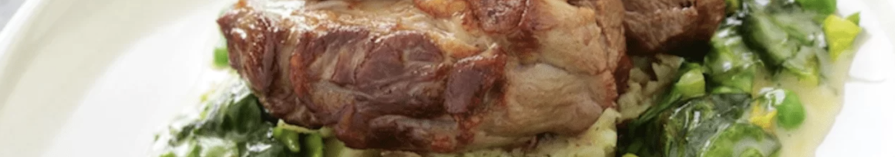 Chump of Lamb, Harissa Crushed Potatoes & with minted Peas & Lettuce in a Smoked Butter served