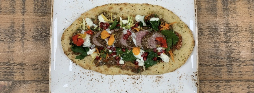 - Warm the wrap through the oven, spread the aubergine caviar on the base, then add the slaw, slice the lamb & season, then lay across the top and finish with the fresh herb salad dressed in lemon juice and olive oil, tzatziki & pomegranate seeds.