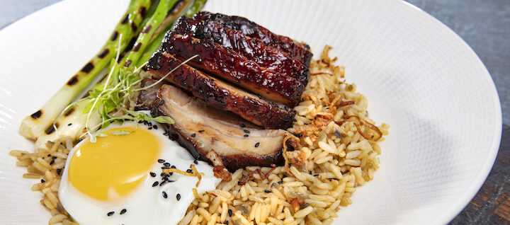 5. Serve the pork with the rice and top with a fried egg and chargrilled spring onions.