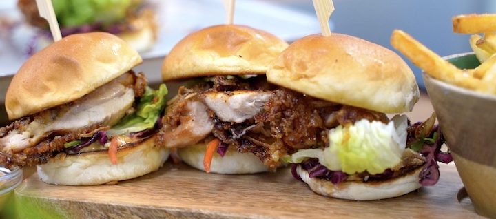 3. Dredge the chicken in the panko mix and deep fry until cooked, then drizzle with the hot chilli maple syrup mix and cut into equal portions for the burger.