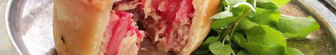 - Fill with pork mix and put rhubarb on top.