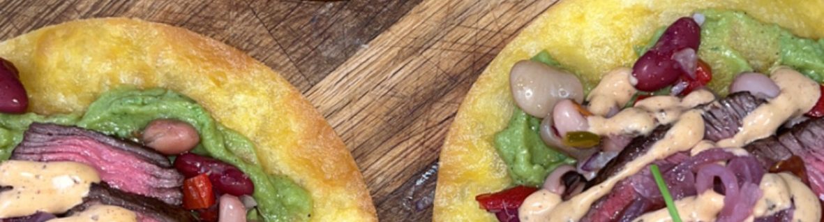 4. Top the tostada with the bean salad , sliced steak , chipotle sauce, salsa, pickled red onions and micro coriander.
