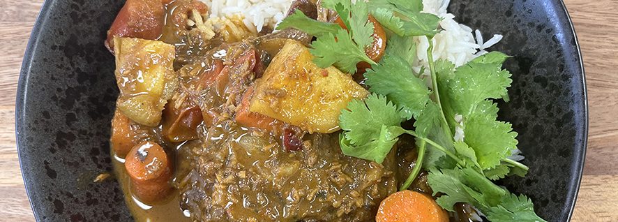 5. Place the steaks along with any juices into the pan and then add the coconut milk, chopped tomatoes and cover, cook for 1 hour then add 1/4 cut potatoes and continue to cook for a further 1- 11/2 hours until beef in tender. Finish with coriander and lime.