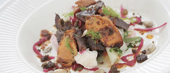 3. Fry the mushrooms in beurre noisette and then fry the gizzards heart and liver. Bring everything together on the plate and drizzle the tomatade and ndjua dressing over the top.